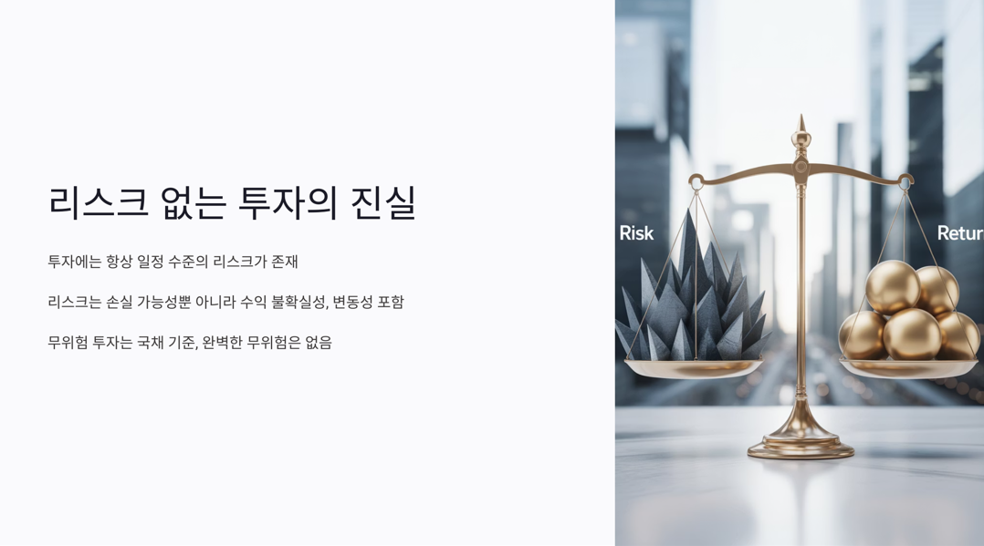 투자를 시작하려는 많은 사람들이 가장 먼저 떠올리는 질문이 바로 이것입니다. "리스크(위험) 없는 투자가 정말 존재할까?" 수익을 추구하는 모든 행위에는 일정 수준의 리스크가 따르기 마련이지만, 사람들은 항상 ‘안전하면서도 수익을 낼 수 있는 투자’를 찾고 싶어합니다. 이 글에서는 리스크 없는 투자의 개념을 제대로 이해하고, 실제로 우리가 접근할 수 있는 ‘사실상 무위험에 가까운 투자’가 어떤 것인지 구체적으로 정리해보겠습니다.